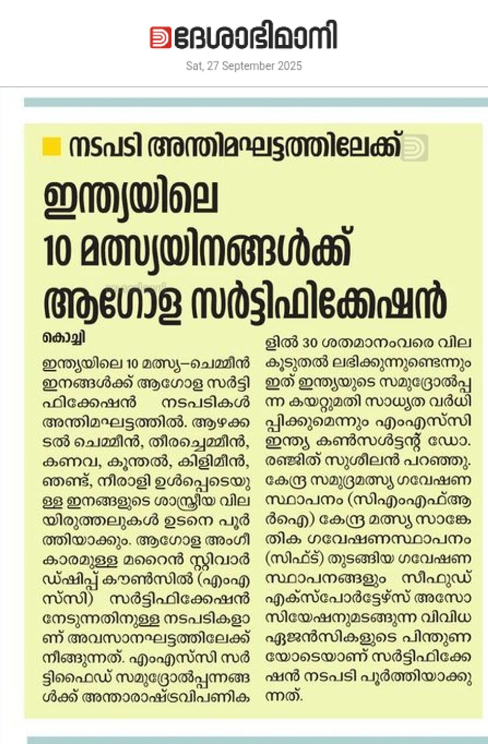 Ten Indian fish varieties for global certification